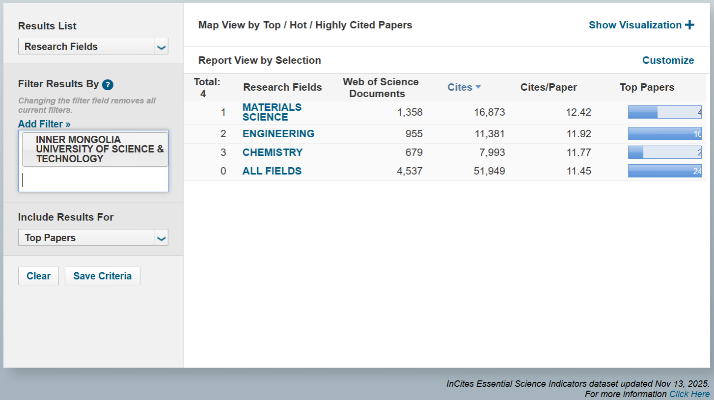 据科睿唯安(Clarivate)2025年11月发布的最新一期《基本科学指标数据库》(Essential Science Indicators,简称ESI)统计数据显示,内蒙古科技大学化学(Chemistry)学科首次进入ESI全球排名前1%,实现学科建设历史性突破,标志着我校化学学科进入国际高水平学科行列。内蒙古科技大学目前已进入ESI前1%的3个学科具体表现如下: