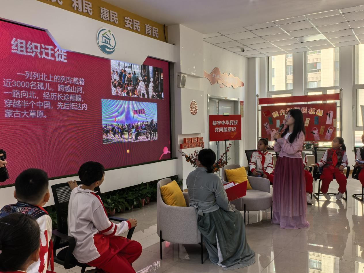 团委志愿者在“红色故事我来讲”环节,以《草原额吉的温暖》为题,讲述了“三千孤儿入内蒙”的感人历史,以真挚叙述引发全场共鸣。同步开展的“党的民族政策知多少”知识问答环节气氛热烈,少先队员们踊跃抢答,在互动中深化了对“五个认同”的理解。
